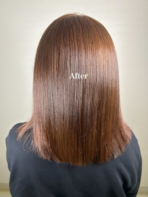 アルカリ酸熱トリートメントとカラーを同時に行うことができるため、カラーダメージを極力抑えながらも酸熱トリートメントのツヤを叶えることができるということです。
